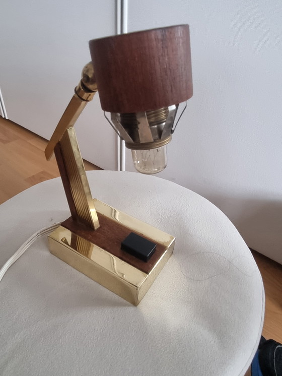 Deze prachtige vintage tafellamp combineert tijdloze elegantie met een functioneel ontwerp. De warme houttint harmonieert perfect met de goudkleurige metalen elementen en voegt een stijlvolle touch toe aan elke ruimte.