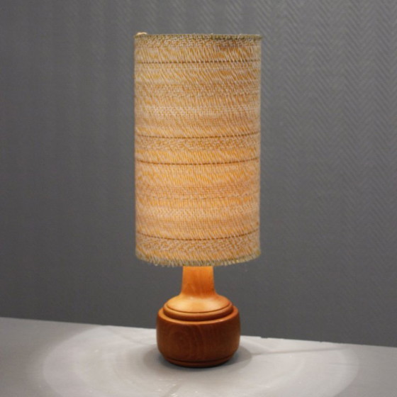 Vintage tafellamp in Scandinavische stijl, gedraaid hout en stof, jaren 70.