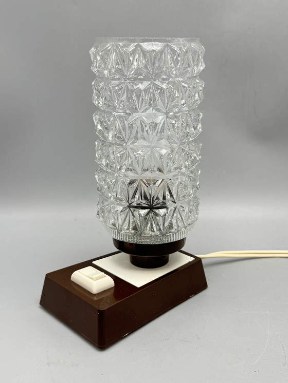 Breng een vleugje retro charme in je interieur met deze prachtige vintage tafellamp. De lamp combineert een stevig kunststof voetstuk in bruin-witte kleurstelling met een opvallende glazen kap in een geometrisch reliëfpatroon. Wanneer de lamp brandt, zorgt het geslepen glas voor een schitterend spel van licht en reflecties – perfect om sfeer te creëren in de woonkamer, slaapkamer of hal.