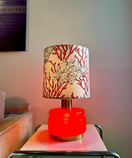 Vintage rode opalen glazen tafellamp van de Duitse fabrikant Peill & Putzler, internationaal bekend om hun glazen lampen uit het midden van de vorige eeuw. In onberispelijke staat. Het prachtige, levendige rood van het glas is bijzonder opvallend wanneer het van binnenuit verlicht wordt. Wanneer de lamp aan is, lijkt het rood bijna oranje/roze. Een zeer typisch ontwerp uit het midden van de vorige eeuw met messingkleurige accenten op de voet en de bovenste glazen kap. Afmetingen: Hoogte lampvoet 30 cm, diameter 25 cm. Totale hoogte met kap: 57 cm.