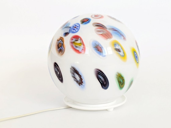 Vintage tafellamp uit de jaren 90 in millefiori-stijl met glazen bol, Italiaanse kunstglazen bol met witte voet.