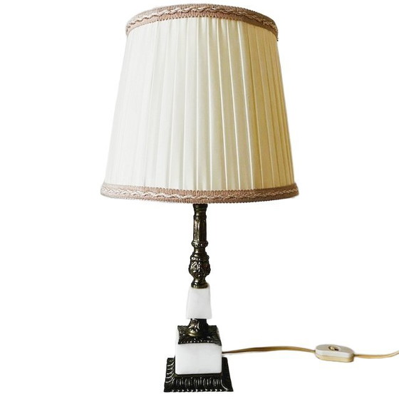 Mooie originele vintage tafellamp met een barok voet van wit marmer en messing uit de jaren 50. Deze tafellamp heeft een linnen kap met zijden bies.