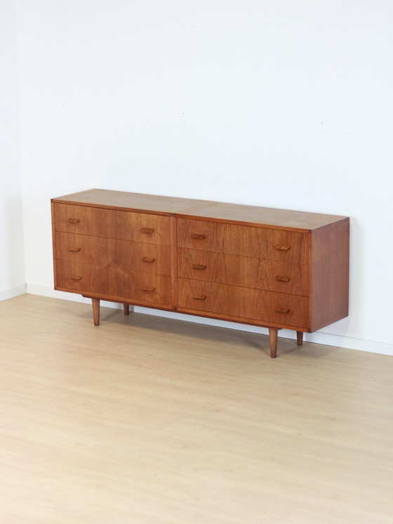 Product Informatie: Een dubbele ladekast die is gemaakt uit twee losse ladekastjes. Totaal 6 ruime lades met mooie nerf en opvallende greepjes.