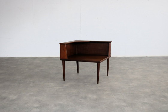 vintage salontafel | hoektafel | jaren 60 | Zweden period | jaren 60 design | onbekend | Zweden condition | goed | lichte gebruikssporen size | 60 x 65,5 x 65,5 (hxbxd) details | teak; artikelnummer | 2979