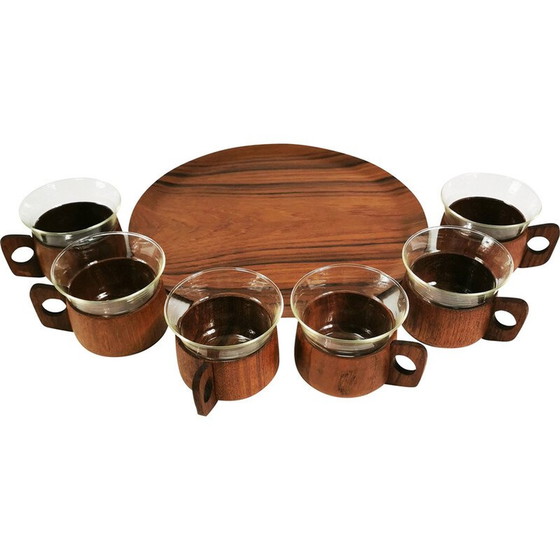 Koffie- en theeservies (6 glazen kopjes, 6 teakhouten handvatten en een dienblad), Schott en Gen Mainz Jena Glas, Duitsland, jaren 1970 (gesigneerd),