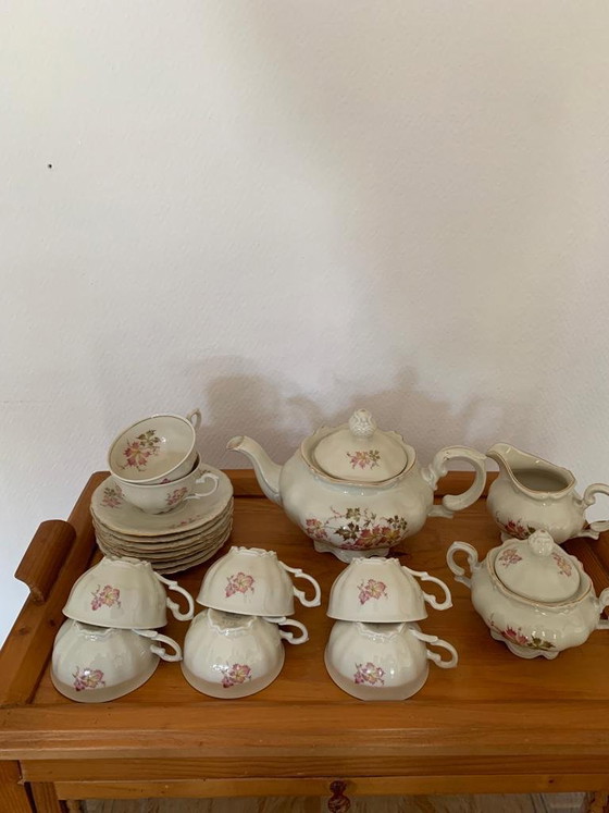 Dit prachtige vintage theeservies van Mosa uit de jaren 1950 brengt een vleugje elegantie en nostalgie in uw huis. Het servies is vervaardigd uit hoogwaardig porselein en versierd met delicate bloemenmotieven in zachte roze tinten, afgewerkt met een subtiele gouden rand.\n\n- Authentiek Mosa theeservies uit de jaren 1950\n- Hoogwaardig porselein met verfijnde bloemenmotieven\n- Perfect voor het serveren van thee in stijl en elegantie\n\nVoeg een stukje geschiedenis toe aan uw tafel en geniet van de charme van vervlogen tijden. Neem vandaag nog contact met ons op voor meer informatie.