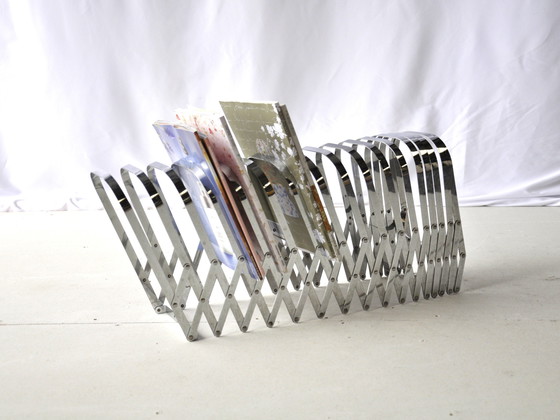 Dit stijlvolle vintage tijdschriftenrek heeft een uniek ontwerp in accordeonstijl, gemaakt van gepolijst chroommetaal. De uitrekbare structuur zorgt voor flexibele opslag, waardoor het perfect is voor het organiseren van tijdschriften, kranten of vinylplaten. Het strakke, moderne uiterlijk maakt het een geweldige aanvulling voor elke woonkamer, kantoor of leeshoek, en past moeiteloos in zowel moderne als retro interieurs.