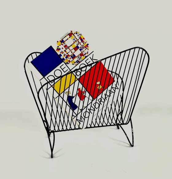 Leuke metalen, industriële look draadstalen tijdschriftenrek uit de jaren 50. Het geheel verkeerd in goede staat. Het boek is ter illustratie en wordt niet meegeleverd.