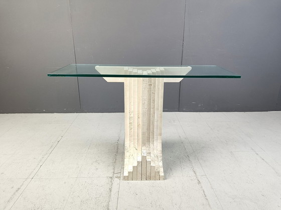 Prachtige architecturale travertijnen consoletafel in de stijl van Carlo Scarpa. Mooie tijdloze uitstraling. In goede staat. Afmetingen: Hoogte: 74cm Breedte: 110cm Diepte: 40cm Ref.: 24120906 Een aangepaste glasmaat kan door ons geleverd worden, neem contact met ons op voor informatie.
