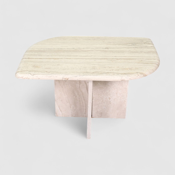 Geweldige massieve travertin bijzettafel of salontafel. Deze tafel van natuursteen komt uit 1990 en heeft een semi organische vorm. Hij is te gebruiken als bijzettafel of als salontafel en is in zeer goede staat. Het originele aanschaflabel is nog aanwezig op de onderzijde: gekocht in Krefeld, 22-06-1990.
