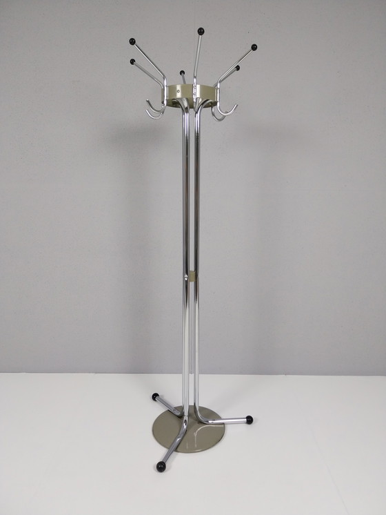 Vintage staande kapstok uit de jaren 60, ontworpen door Willy Van Der Meeren voor de Belgische fabrikant Tubax. Deze kapstok is uitgevoerd in verchroomd staal en heeft een strak, minimalistisch ontwerp dat typerend is voor het functionele modernisme waar Van Der Meeren om bekendstaat. Bovenaan bevinden zich meerdere haken met zwarte kunststof uiteinden. De stabiele driepootvoet zorgt ervoor dat de kapstok stevig staat. Een mooi en praktisch voorbeeld van Belgisch mid-century design dat zowel functioneel als decoratief is in een hal, kantoor of vintage interieur. De kapstok verkeert in goede vintage staat met lichte gebruikssporen die passen bij de leeftijd.