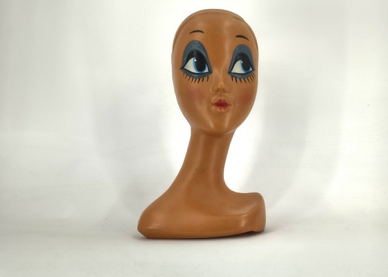 Geschilderde plastic hoedkop in de vorm van Twiggy, een afbeelding van het beroemde iconische Engelse model uit de jaren 60, Lesley Hornby, ook bekend als Dame Lesley Lawson.