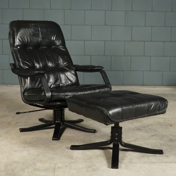 Deze vintage Unico draaifauteuil/relaxfauteuil met bijpassende hocker zit absoluut heerlijk! De Deense fauteuil uit de jaren 70 kan niet alleen heerlijk draaien, maar ook de leuning kan middels een hendel aan de zijkant van de stoel in een relaxstand worden gezet. Het is een echte design “loungechair” en heeft een zwart leren bekleding. De fauteuil en hocker zijn ondanks de hoge leeftijd nagenoeg in nieuwstaat!
