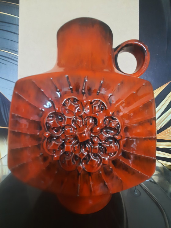 Deze opvallende vintage vaas in een levendige oranje kleur is een echte blikvanger voor elk interieur. Met zijn unieke ontwerp en gedetailleerde afwerking voegt deze vaas een vleugje retro charme toe aan uw woonruimte.