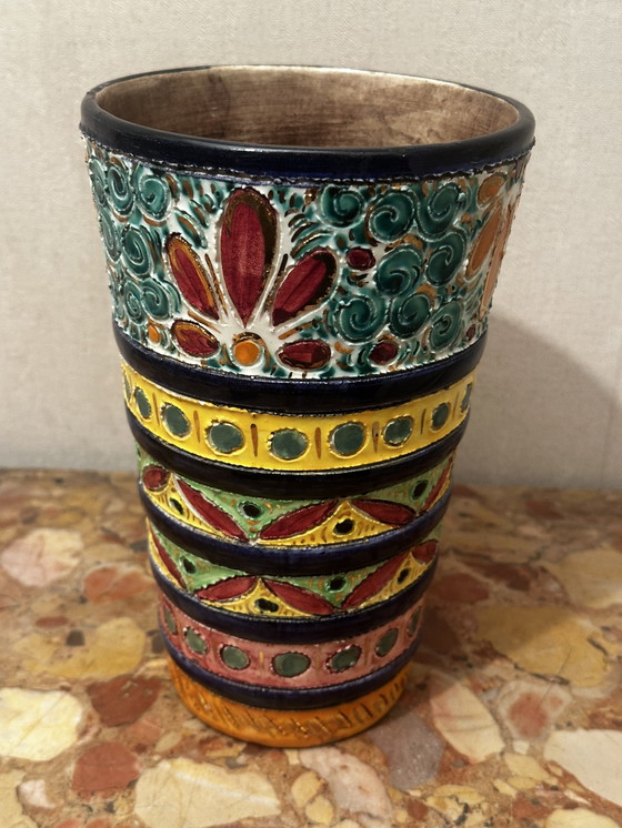 Vintage vaas met gebeitelde en beschilderde decoratie - Devres aardewerk