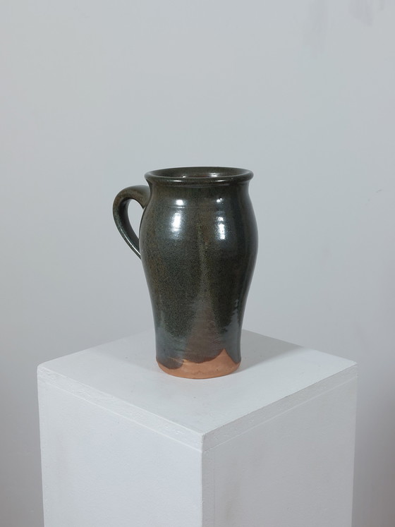 Deze vintage vaas met handvat uit het midden van de vorige eeuw belichaamt de charme van de landelijke stijl en is een waar juweel voor uw huis. De vaas betovert met zijn elegante glazuur in een harmonieuze tint, die een warme en uitnodigende sfeer creëert in elke kamer.