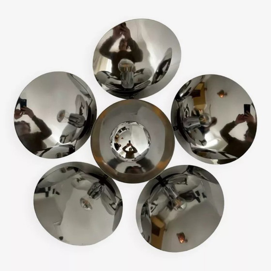 Verchroomde metalen wandlamp geproduceerd in Frankrijk in de jaren 70. Deze wandlamp bestaat uit 5 gebogen verchroomde schijven en is een mooi voorbeeld van de jaren 70, waarbij kwaliteitsmaterialen en assemblage worden gecombineerd met een innovatief ontwerp. E27 zilveren lamp meegeleverd. Klaar voor installatie.