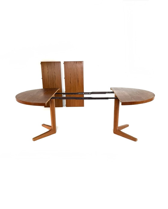 Prachtige geliefde verlengbare Deense eettafel. Massief teakhouten poot, mooi organisch vormgegeven. De poot is eenvoudig te demonteren en dat maakt de tafel eenvoudig te vervoeren.
