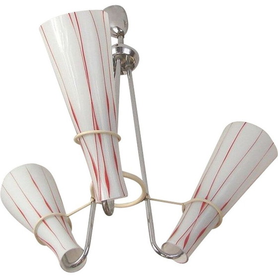 Zukov kroonluchter, 1970. De kroonluchter is gemaakt van vernikkeld staal met glazen kapjes bestaande uit twee lagen. Vereist 3 E14 lampenAfmetingen:hoogte 60cmbreedte 55cmkop 55cm