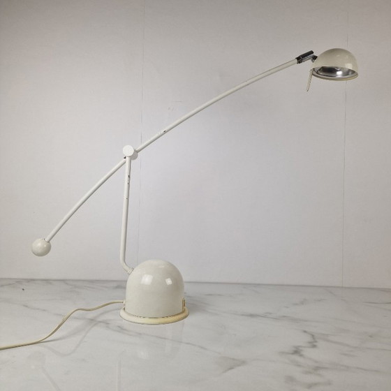Het ontwerp combineert functionaliteit met een verfijnde modernistische esthetiek, waardoor de lamp ideaal is als bureaulamp, leeslamp of accentstuk in een eigentijds of mid-century interieur. De stevige halfronde voet zorgt voor uitstekende stabiliteit, terwijl de beweegbare arm flexibele positionering mogelijk maakt.