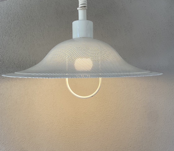 Prachtige vintage witte in hoogte verstelbare hanglamp in de stijl van Pilastro. De lamp heeft een geperforeerde kap, wat een mooi effect heeft als de lamp aan is.