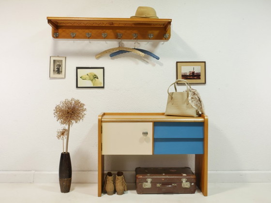 Deze originele gangset uit de jaren 1960 bestaat uit een kleine kast en een bijpassende haakrail met hoedenplank.