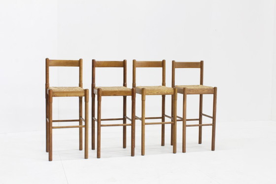 Vintage Vico Magistretti barkrukken set van essenhout en stro, Italië