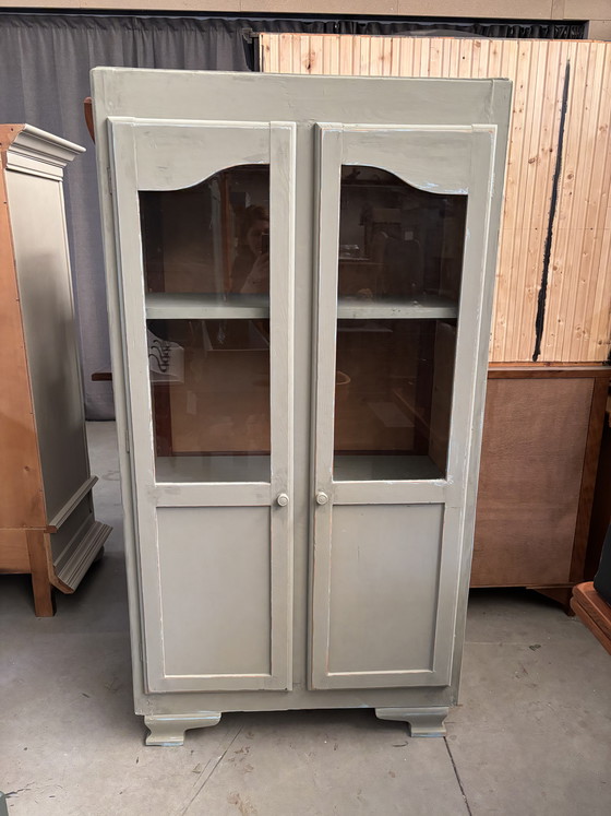 Te koop leuke gerestylde vintage vitrinekast in zachtgroene kleur. De kast is een geheel. Afmeting: 90B x 49D x 170H.