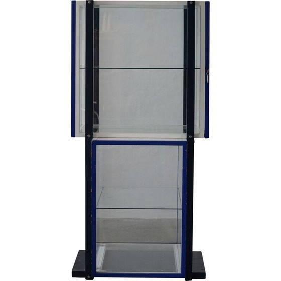 Zeldzame vintage vitrine van glas, hout en metaal. Ontworpen door Marcel Breuer in 1925. Dit model is geproduceerd door Tecta op licentie - een op maat gemaakt model in de kleuren blauw en wit. Gemaakt in het begin van de jaren 1980. Dit is geverifieerd door Tecta. "Marcel Breuer had altijd een structurele en architecturale manier van denken. De glazen kast S40 ziet eruit als een miniatuur wolkenkrabber in New York: de gestapelde elementen zijn duidelijk te onderscheiden, de constructie verrassend. Het lijkt alsof Breuer de basis eenvoudigweg onder de schoren heeft geschoven. Daardoor heeft het twee totaal verschillende gezichten. De zijkanten steken naar buiten en naar binnen, waardoor een uitkragende vorm ontstaat. Breuer ontwierp geenszins een monoliet, maar een dynamische sculptuur die doet denken aan grote vorkheftrucks die containers oppikken en vervoeren in een haven."