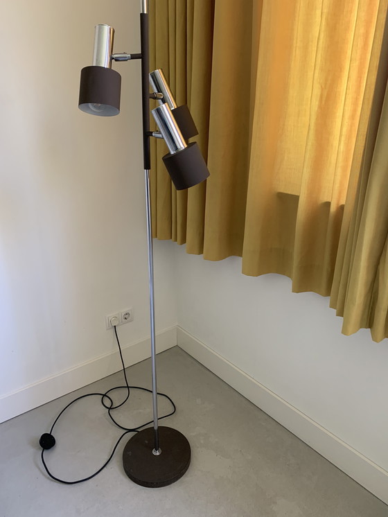 Deze vintage vloerlamp heeft een strak ontwerp met een combinatie van bruin en zilverkleurig metaal. Het heeft meerdere verstelbare lampenkoppen, waardoor het perfect is om licht te richten waar dat nodig is. De lamp staat op een stevige voet en voegt een vleugje retro-elegant toe aan elke kamer.