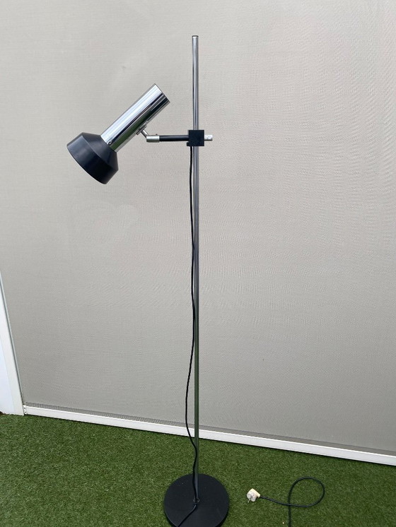 Vloerlamp van OMI. Chroom met zwarte accenten en witte schakelaars. Vloerlamp is 40 cm breed en 162 cm hoog. Duits mid-century design.