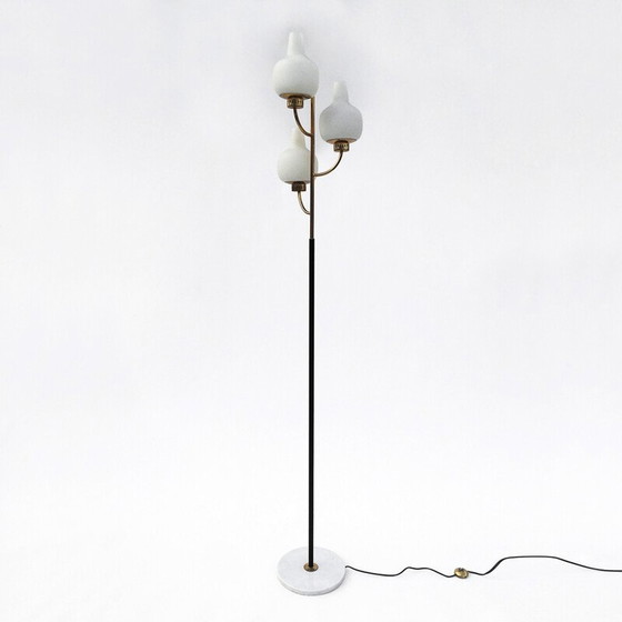 Stilnovo vloerlamp met drie messing boogtakken, elk met een wit matglazen kap, op een zwart geëmailleerde paal en marmeren voet. Slijtage in overeenstemming met leeftijd en gebruik. Enkele krassen en messing patina.