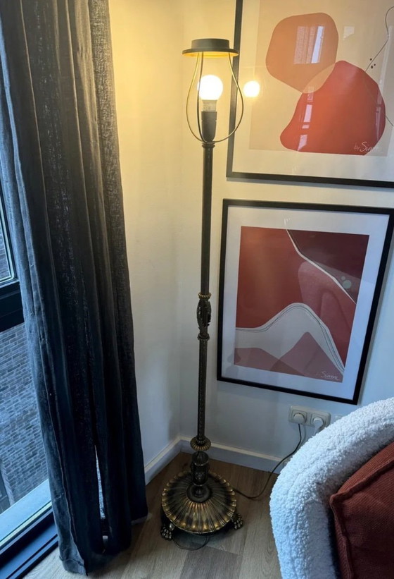 Deze vintage vloerlamp heeft ingewikkelde details en een klassiek ontwerp, perfect om een vleugje elegantie toe te voegen aan elke kamer. De lamp is voornamelijk goudkleurig (lampvorm niet inbegrepen), gemaakt van duurzaam metaal. De tijdloze stijl maakt het een veelzijdig stuk voor verschillende interieurdecors.