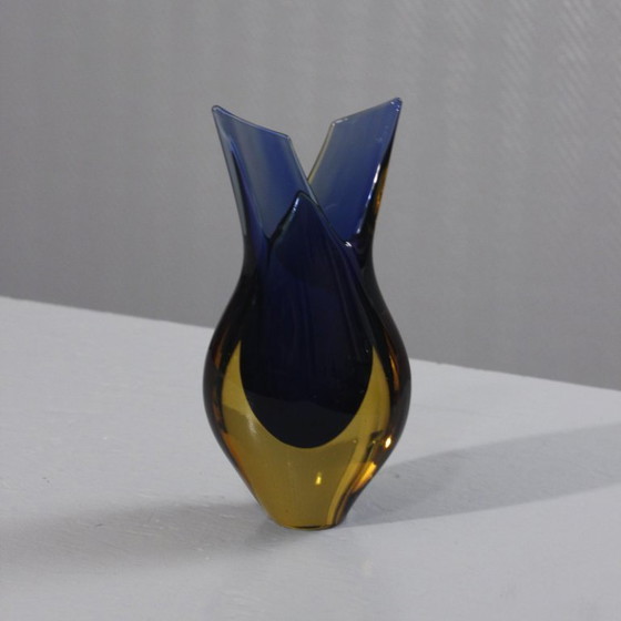 Vintage vaas met vrije vorm van blauw en amberkleurig Muranoglas, Sommerso-techniek, geslepen, getrokken en afgeplatte hals, ontworpen door Flavio Poli, Italië, circa 1970.