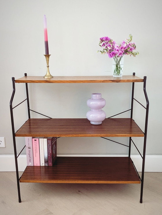 Vintage (boeken) kastje, schappenkastje WHB. Het wandrek is vrijstaand en modulair. Het heeft teakhouten planken en is in zeer goede vintage staat. Er is evt een identiek kastje verkrijgbaar.