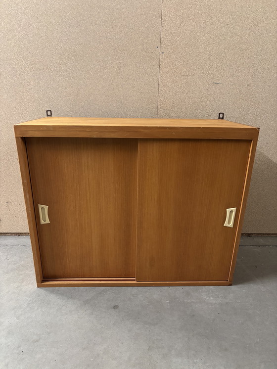 Te koop gaaf vintage wandkastje met schuifdeuren die naar beide kanten open kunnen. Leuk om