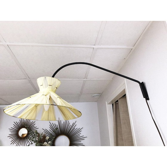 Vintage galgenwandlamp uit de jaren 60. Zwart metalen buisvormig frame. Diabolokap in lichtgeel vinyl. Stroomvoorziening. Diepte 80 cm, diameter 40 cm.