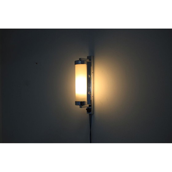 <span>Deze wandlamp is ontworpen in Tsjecho-Slowakije en is gemaakt van chroom en opaal glas. Hij is in originele staat en nog volledig functioneel.</span>