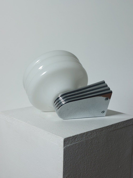- Hergestellt aus hochwertigem Milchglas und Chrom, bietet diese Lampe nicht nur Langlebigkeit, sondern auch eine zeitlose Ästhetik.