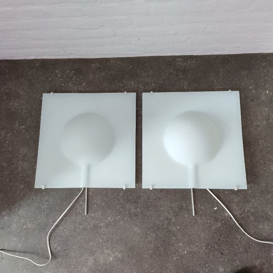 Mat witte ( witte binnenkant ) wandlampen set ontworpen door Cecilia Johansson. Het glas zit in een metalen houder. Deze houdt het glas op zijn plek door de haakjes die klemmen door een veer. De lamp heeft een snoer en een schakelaar (metalen buisje) waar je aan kan trekken. De lamp is lastig te fotograferen maar past in vele interieurs. Original Edison screw-fitting (E27) voor 1 60 watt lamp. De lampen geven mooi diffuus licht. Als je van het licht van rijst papier lampen houdt zal je deze ook mooi vinden. Het ontwerp past in vele verschillende interieurs van japandi / wabi sabi tot modern en Memphis design. De lampen zijn in nette vintage staat. Designer : Cecilia Johansson voor Ikea Type : Stämning V0008. Gemaakt in 90's. Afmetingen : hoogte - 39 cm breedte - 39 cm diepte - 10 cm
