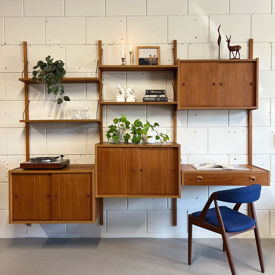 Prachtig vintage teakhouten wandsysteem, PS system, met messing beugels (patina) en houten wandlatten.