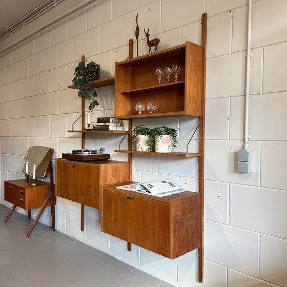 De kleinere variant van het eerder getoonde XL meubel; dit teakhouten wandsysteem, PS system, met messing beugels (patina) en houten wandlatten.