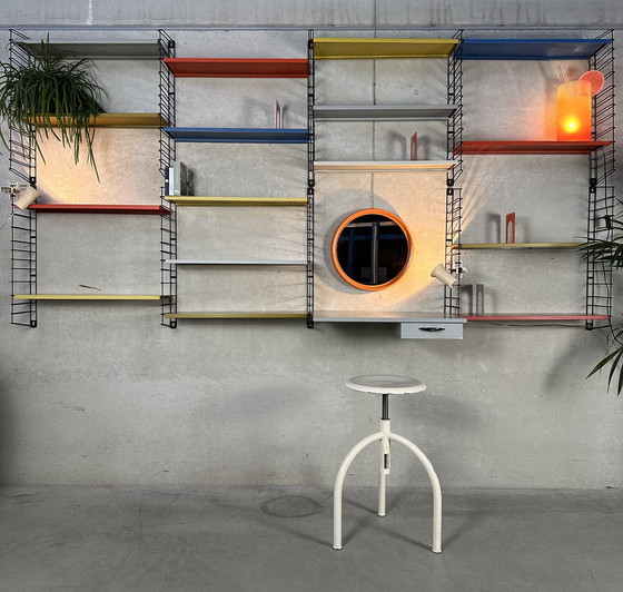 Compleet (28-delig) vintage wandrek met schrijf- of make-uptafel + lade. Inclusief vintage metalen kruk van ManuBelge, 5 metalen boekensteunen van NVF en 1 spiegel van Lange. Het wandrek is moduleerbaar en bestaat uit: 16 leggers, 1 tafelblad, 1 lade en 8 dubbele steunen. Gemerkt met Tomado Holland. Verstelbare kruk gemerkt. Boekensteunen gemerkt. Spiegel gemerkt. Volledig demonteerbaar. Afmetingen zoals op de foto (maar is aan te passen naar eenieders voorkeur): Breedte: 270cm. Hoogte: 137cm. Diepte rek: 20,5cm. Diepte desk: 41cm. Aanvaardbare gebruikssporen (krasjes).