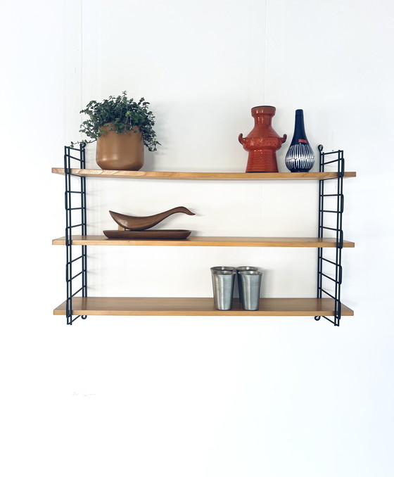 2 zwart gecoate laddervormige rekken die eenvoudig met 2 schroeven te bevestigen zijn aan de muur. Het wandrek heeft 3 beukenhouten plankjes die in de schapjes vallen. Een leuke eye-catcher aan je muur om je mooiste items tentoon te stellen. In nette gebruikte staat, geen schade.