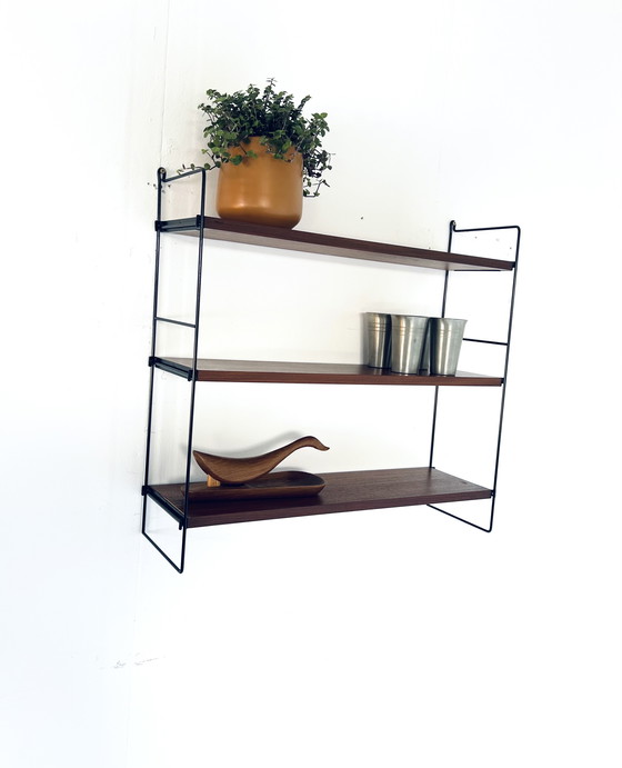 2 zwart gecoate laddervormige rekken die eenvoudig met slechts 2 schroeven op te hangen zijn aan de muur. Het rek is voorzien van 3 teakhouten plankjes die eenvoudig in de rekjes vallen. Een prachtige eye-catcher aan de muur om je favoriete items tentoon te stellen. In hele nette staat.