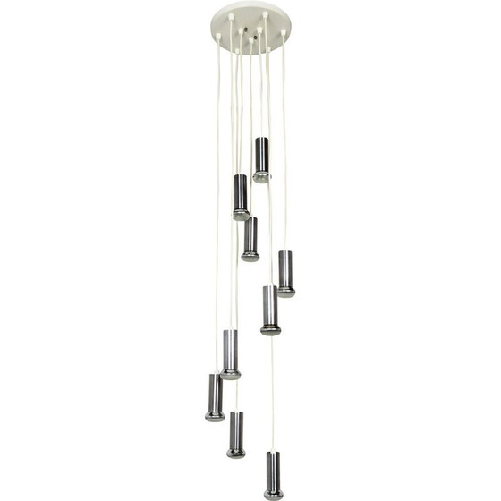 Cascade plafondlamp van Raak 1970. 9 geborsteld roestvrij stalen "buis" spots opgehangen op verschillende hoogtes. Wit gelakt metalen plafondrozet. Nieuwe elektrificatie. Sporen van Raak label aan de binnenkant van de buis. Lampen meegeleverd.