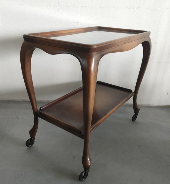Prachtige vintage design serveerwagen/trolly in overall prima staat met gebruikerssporen (zie onder). Past in zowel een klassiek als een modern huis/stijl, ook zien wij het in een 'gotische' country style omgeving volledig tot zijn recht komen. De glasplaat ligt over een webbing/rotan gevlochten 'blad' wat een prachtig design/patroon heeft. Compleet origineel, de wielen rijden uitstekend. De stijl wordt gelinkt aan Louis de XVé stijl- en/of ook wel de Chippendale stijl. Vermoedelijk jaren 50 periode toegeschreven, Hohnert Design, Duitsland was ook bekend om deze meubelen. Geen label/makersmerk aanwezig. Desondanks een zeer zeldzaam en bijzonder item. De verderop vermeldde afmetingen kunt u doorgeven aan een koerier. Item wordt bij voorkeur niet verzonden, erg kwetsbaar. De afmetingen van het item zelf zijn; 67,5 cm hoog, 71 cm breed, 41 cm diep. Hoogte onderplaat vanaf de grond gemeten; 24,5 cm, breedte 66 cm, diepte 36 cm. Vraagprijs 395,-, serieuze biedingen worden overwogen.