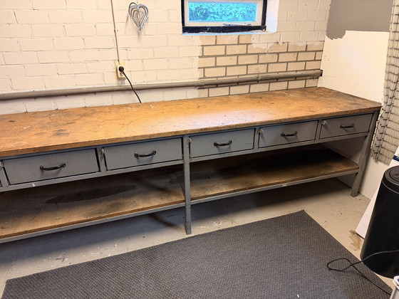 Stap terug in de tijd met deze vintage werkbank, perfect om een vleugje industriële charme aan je ruimte toe te voegen. Met zijn stevige metalen frame en ruime houten blad gaat dit stuk niet alleen over uiterlijk - het is gebouwd om lang mee te gaan. Of je nu een doe-het-zelf-liefhebber bent of gewoon van de robuuste esthetiek houdt, deze werkbank is een fantastische vondst.