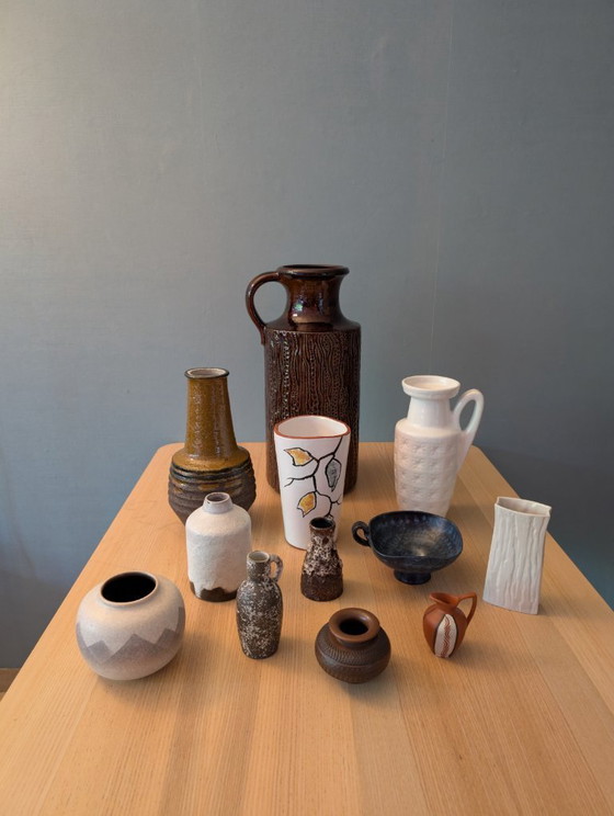 Ontdek de tijdloze schoonheid van deze prachtige set West Germany vintage vazen. Elke vaas vertelt een eigen verhaal met unieke motieven zoals blad- en boombastpatronen, die een vleugje natuur in uw interieur brengen. De grootste bruine vaas mist een kleine chip, verder is alles in uitmuntende staat. De genoemde afmetingen zijn van de grootste vaas.