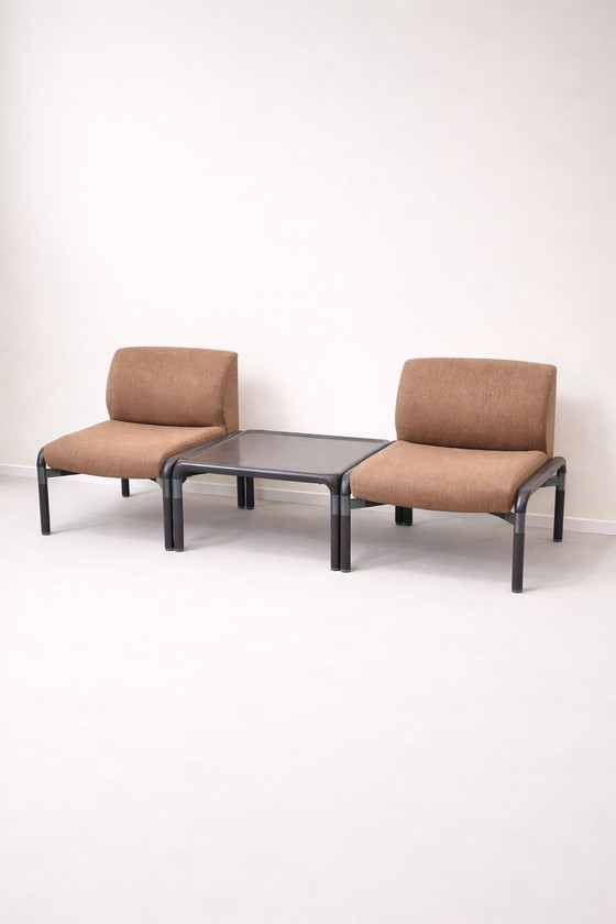 De set bestaat uit twee lage fauteuils met een bijpassend verbindings-/bijzettafeltje. Dankzij het modulaire systeem kunnen de elementen los of samen geplaatst worden.